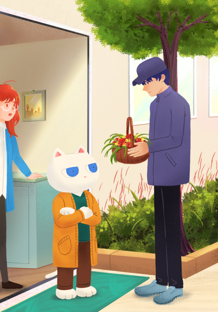 칼은 그 말에 대답하지 않았고 품에 들고 있던 꽃바구니를 조심스럽게 현관문 앞 바닥,
