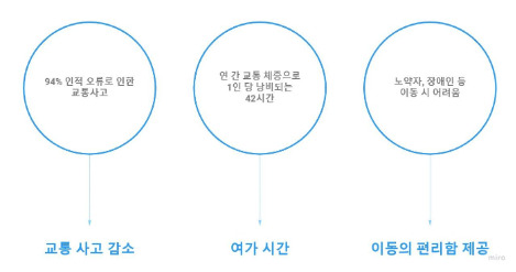 또한 기약 없이 정체되는 교통 체증과 노약자, 시각장애인 등 운전을 하기 위험한 사람들의 불편한 문제를 을 자율주행으로 풀어가고자 했습니다.