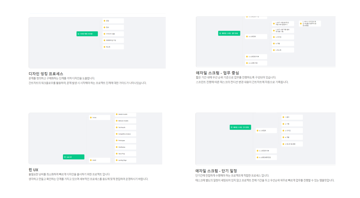 복잡해서 따로 공부를 하고 설계해야 하는 디자인 씽킹 프로세스, 린 방법론까지 쉽게 활용이 가능하고, 애자일 방식도 업무 중심과 단기 일정으로 나워져 있어서 기간 설정이 필요한 스프린트는 업무 중심, 단기간에 빠르게 우선순위대로 처리가 필요한 일은 단기 일정으로 사용하면 효율적인 업무 관리가 가능합니다.