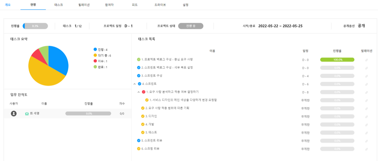 그리고 프로젝트 진척도, 각 태스크 별 진행률, 팀 구성원 간 진행률 등을 시각화하여 한눈에 쉽게 확인할 수 있는 대시보드가 있습니다. 저와 같이 프로젝트를 관리 혹은 리더, 여러 프로젝트를 담당하시고 계신 분들에게 매우 필요한 기능인 것 같습니다.