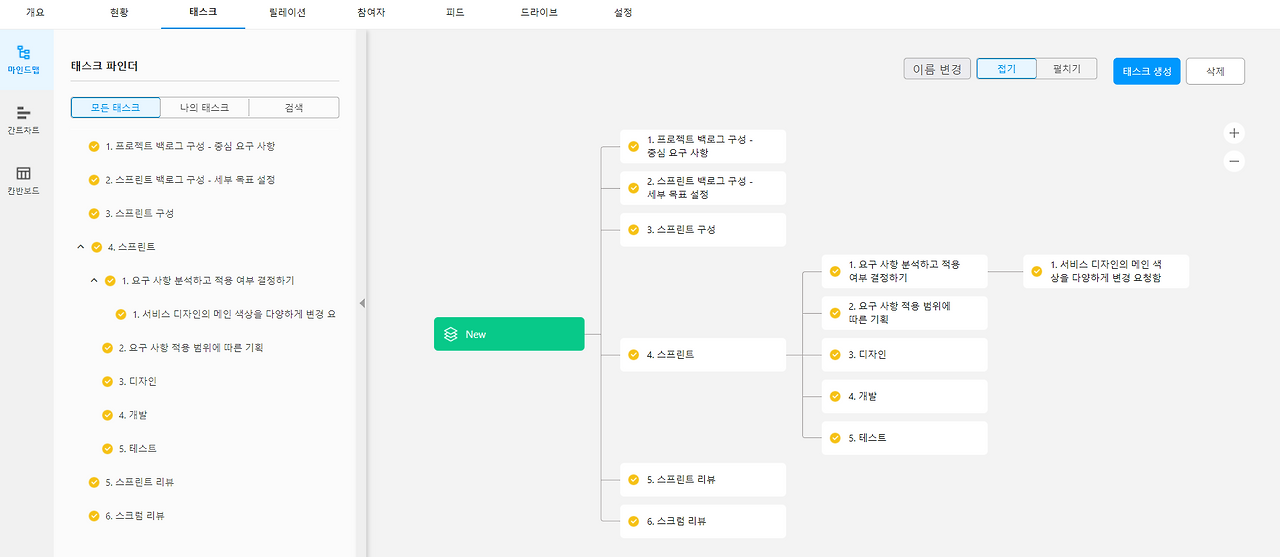 클로바인을 사용해보면서 많은 도움을 받은 부분이 바로 태스크 탭에 있는 마인드 맵, 간트 차트, 칸반 보드 기능입니다. 이미지로 보이는 것처럼 태스크가 굉장히 디테일하게 구성되어 있습니다. 사실 다른 협업 툴은 프로세스를 직접 설계를 해야 해서 시간이 많이 들고, 불필요하거나 과도한 태스크를 작성하는 경우가 많은데 클로바인은 확실하게 가이드해주니까 효율적이고 편리했습니다.