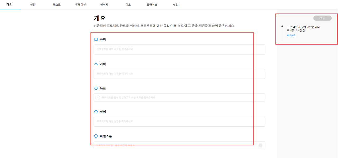 어떤 프로젝트든지 구성원들 간 공감할 수 있는 목표, KPI, OKRs를 협의하고 결정해서 공동의 미션으로 생각하는 과정이 필요합니다. 클로바인에서도 개요 화면에서 팀원들 간 결정한 규칙, 목표를 작성하고 관리할 수 있습니다. 또 오른쪽에 활동 로그가 기록되어 자신이 한 업무, 팀원들의 진행 과정들을 알 수 있습니다.