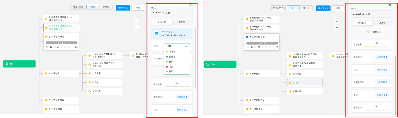 그리고 각 태스크 클릭 시 오른쪽 세부 설정 메뉴를 볼 수 있습니다.