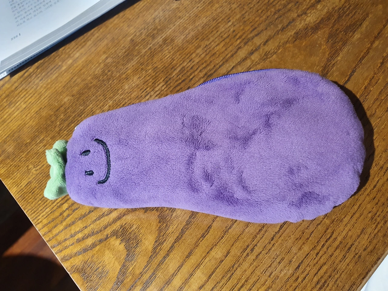 아이들을 따라 다이소에서 구매한 가지 필통(1000원). 평소 쓰던 거친 촉감의 필통이 아니라 잘 쓰고 있다.