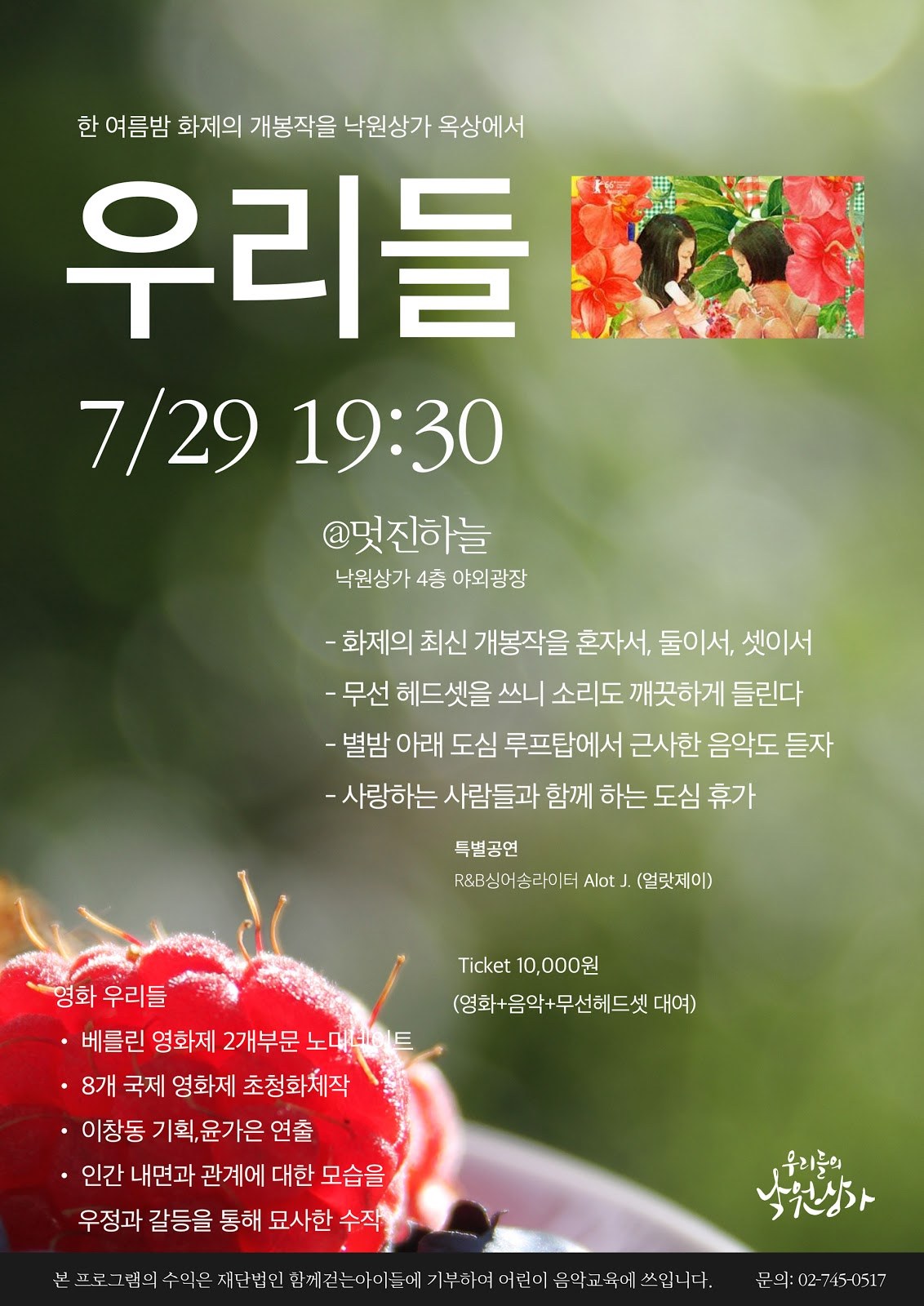 한강다리밑영화제처럼, 우리도 도심에서 즐길 수 있는 다양한 문화행사들이 늘어나고 있어 이런 행사에 죽고못사는 나는 너무 즐겁다. 슬슬 돗자리 가지고 나가서 강바람 맞으며 치킨먹고 영화도 보고, 퇴근하고 낙원에서 만나 옥상에서 영화보고 익선동 골목에서 밥먹고- '저녁이 있는 삶'이란 이런게 아닐까 싶은 생각이 든다.
