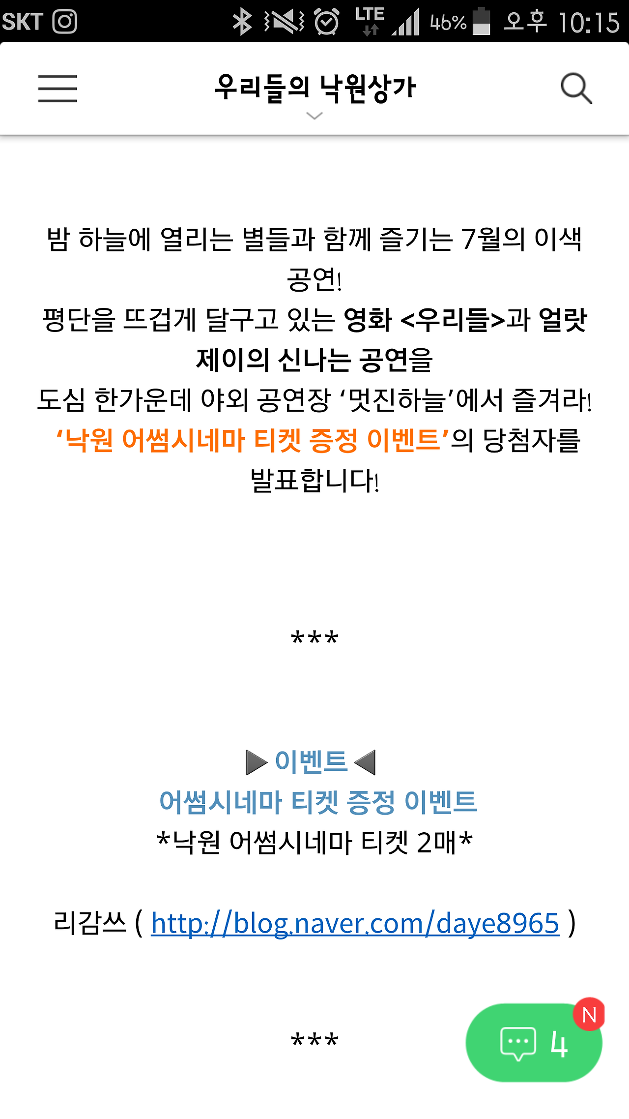 그래서 바로 핸드폰을 들어 낙원상가 블로그에 들어가보니, 마침 금요일에 영화상영을 진행한다는 거다. 짧은 공연도 함께. 블로그 댓글로 초청이벤트도 진행하고 있었는데 아직 덜 알려져서인지 사람들이 댓글을 별로 안달았길래 냉큼 달았다가, 당첨됐다(내가 왕년에 당첨의 신이었다. EBS스페이스공감도 4번인가 당첨되고, 개콘 유희열의스케치북부터 뭐 라디오사연, 수많은 공연들... 20대 초반엔 정말 기회가 많이 돌아왔다).