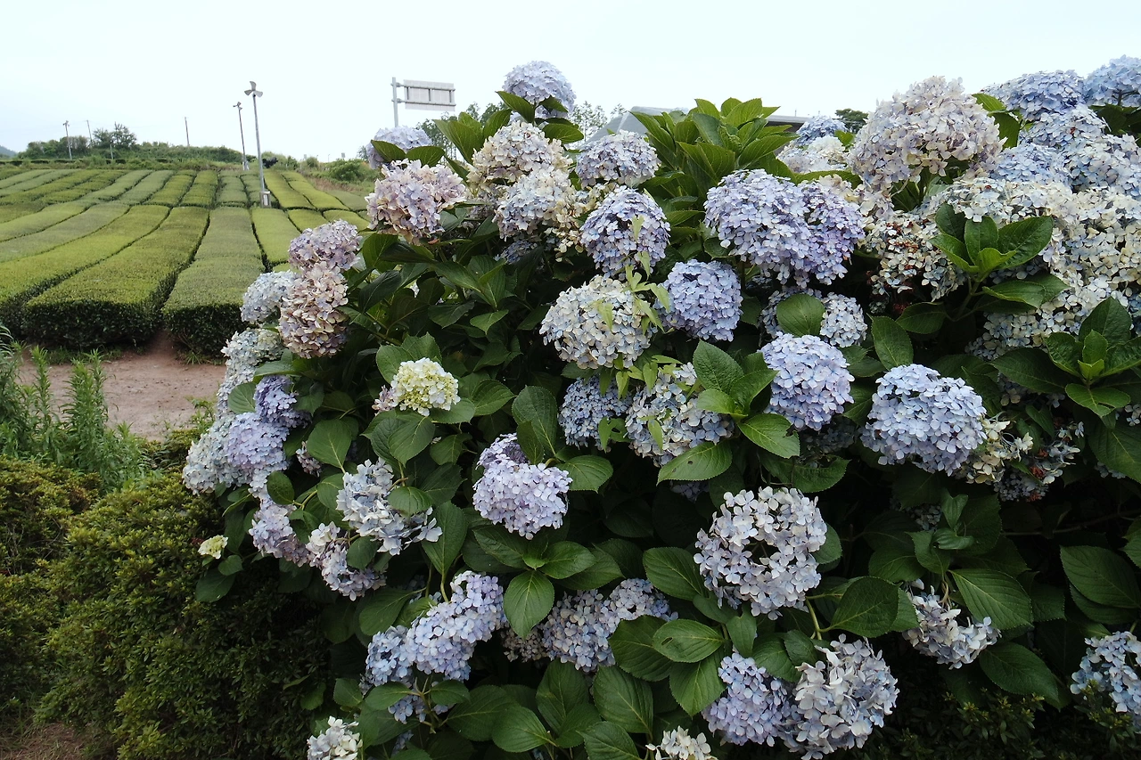 해바라기 말고도 제주에서 볼 수 있는 초록 녹차밭도 여름느낌 물씬 풍겼다. 그 옆에서, 많이 시들었지만 수국도 볼 수 있었다. 과연, 제주의 꽃은 유채만 있는게 아니었다.
