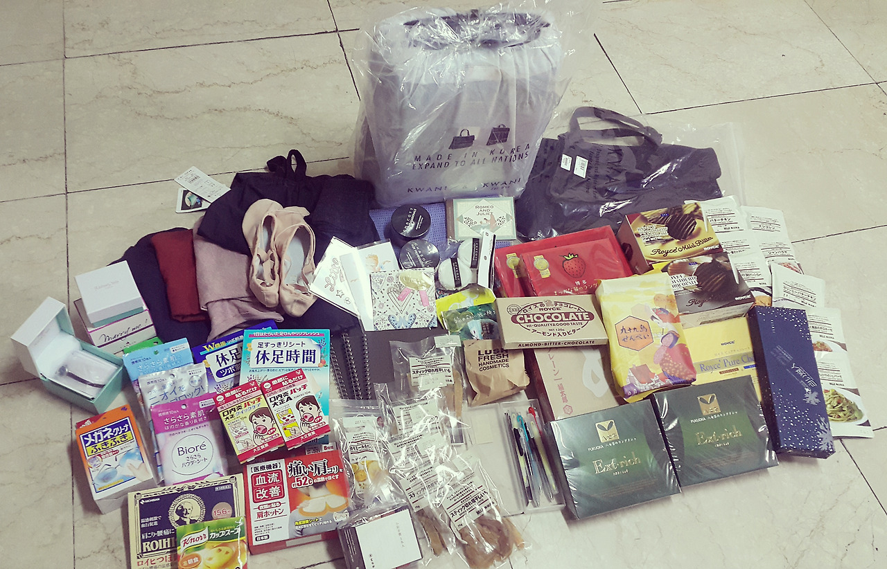 그 외에도 면세점에서 산 것들과 회사사람들에게 돌릴 일본 간식, 가족들과 친구들에게 나눠줄 유명한 로이스 감자칩초콜렛, 내가 먹을 로이스 아몬드초콜렛 등등을 잔뜩 사와서 완전 양손 무겁게 돌아왔다. 분명 갈때는 캐리어 절반을 다 비워갔는데, 저렇게 잔뜩 샀으니 도무지 넣을 자리도 없고 무게도 넘쳐서 결국 공항에서 잔뜩 손에 들고 오느라 어깨가 빠질 뻔 했다.