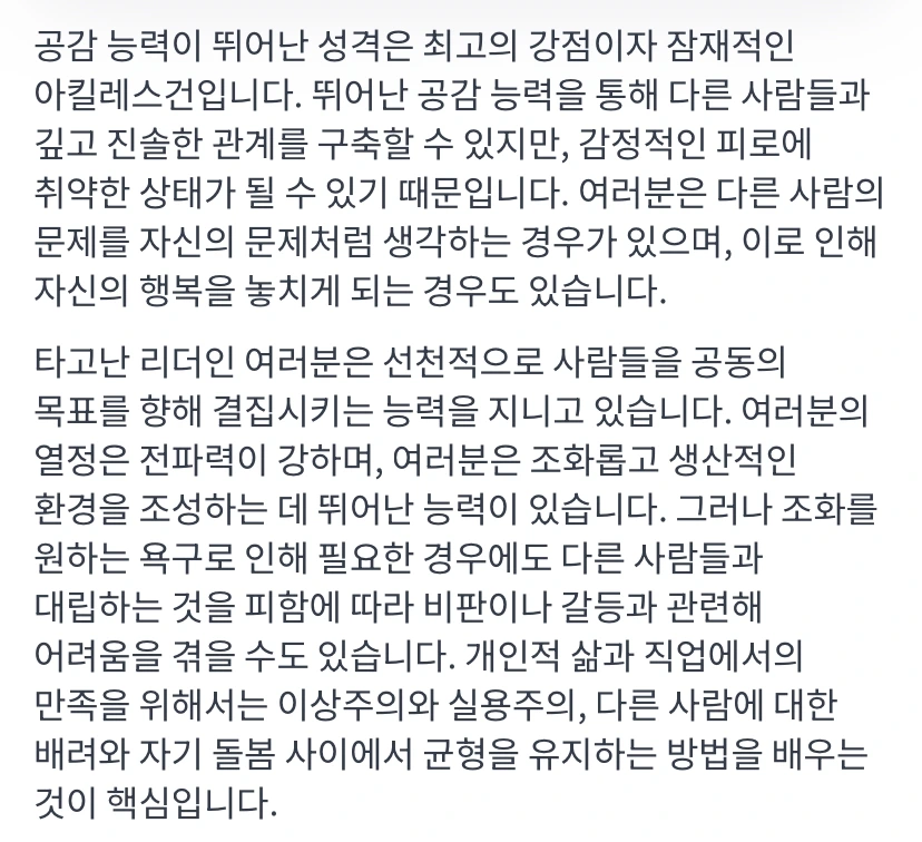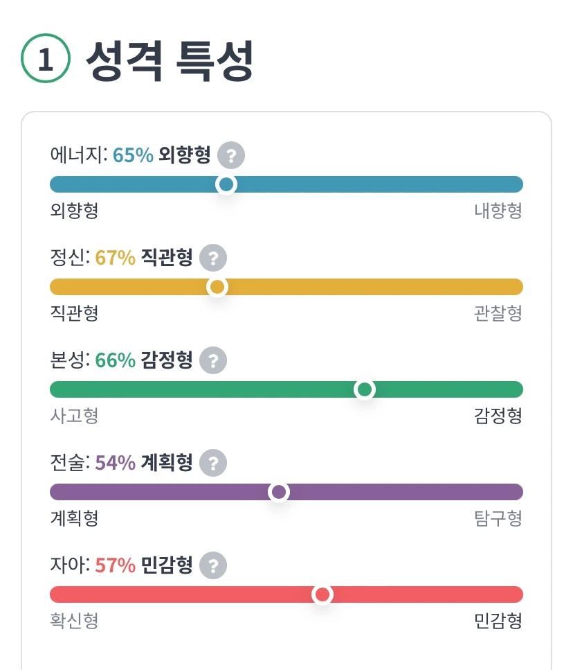 친구들이 “너 완전 ESFJ야”라고 말하면, 나도 “그렇지, 나 원래 이래” 하며 아무 의심 없이 받아들였다. 1년에 한 번씩 검사를 해도 결과는 늘 같았다. 비율만 조금 달라질 뿐, 나는 늘 같은 사람처럼 보였다.