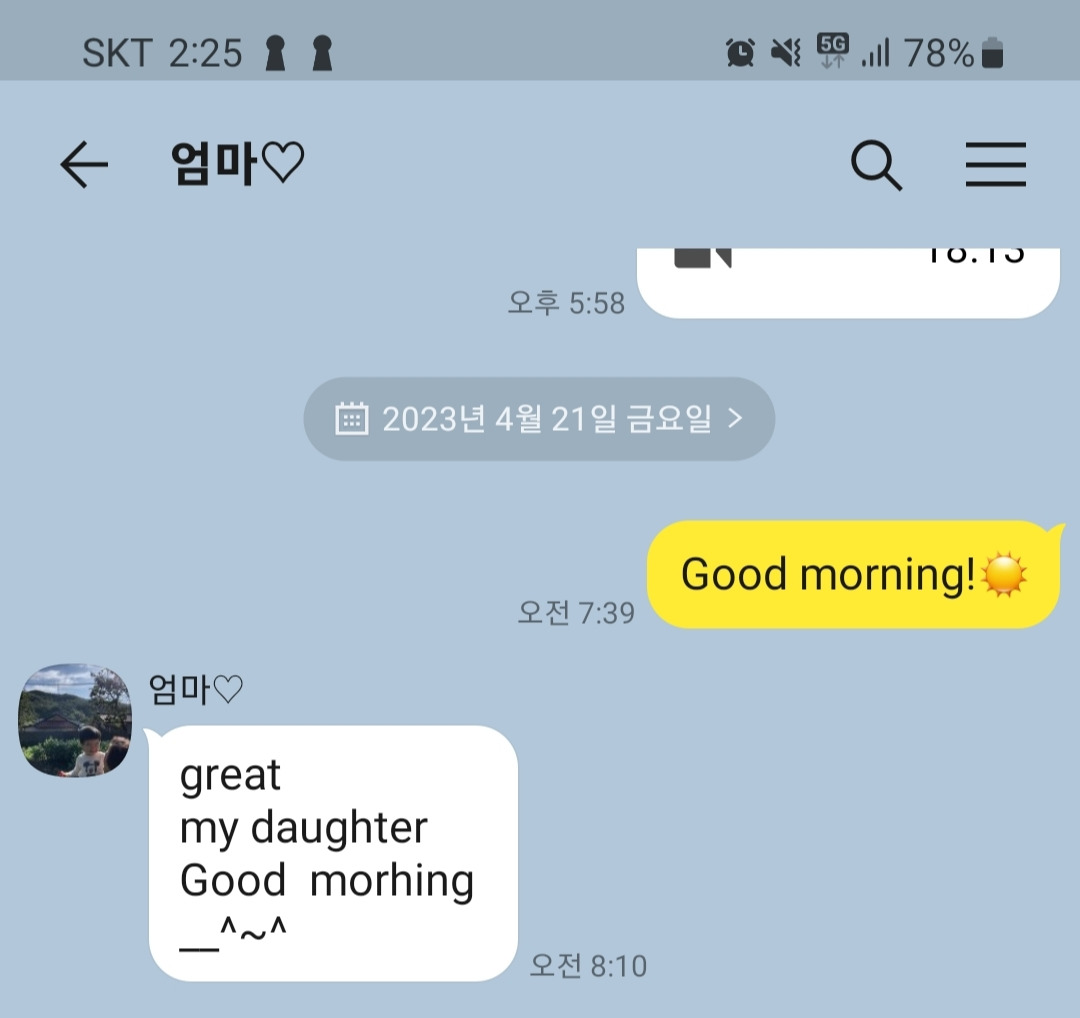 다음날 공부하는 엄마에게 응원이 될까 싶어 "good morning"이라고 카톡을 보냈다.