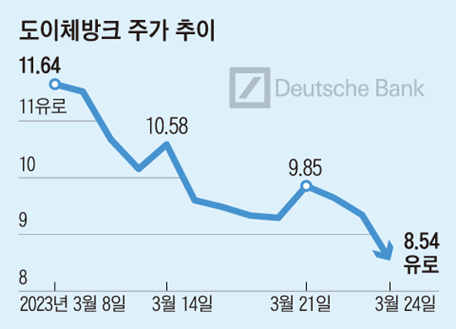 월스트리트저널(WSJ)은 도이체방크의 CDS 프리미엄 5년물이 이달 초 88bp(1bp=0.01%포인트)에서 이날 222bp로 높아졌다고 보도하여 도이체방크의 채무불이행 가능성을 알렸습니다. 이에 따라 도이체방크의 주가는 3월 24일 기준 8.54유로로 급락하였고, 앞으로의 미래는 어떻게 될지 걱정이 되는 현황입니다.