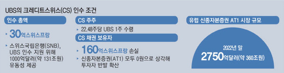 SVB 은행에 이어 CS은행마저 매각되어 이 과정에서 코코본드 전액이 상각되었습니다. 160억 스위스프랑(약 22조 6000억원) 규모의 신종자본증권(AT1)이 상각 처리되면서 가치가 하루 아침에 휴지조각이 된 것이죠.