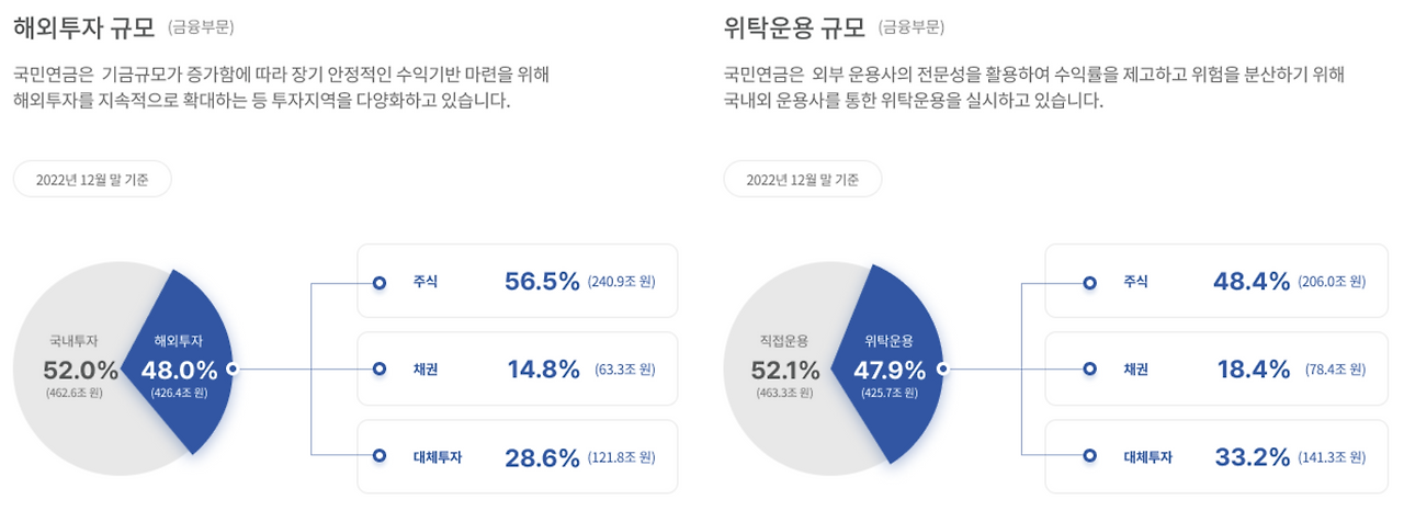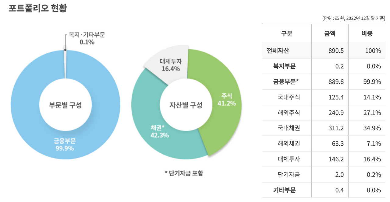 국민연금기금은 1988년 국민연급법에 따라 설치된 이래 지속적으로 성장하여 2022년 12월 말 현재 운용규모가 890조원에 이릅니다. 기금운용본부는 국민연금기금의 안정적인 성과 제고와 위험 분산을 위해 국내채권의 비중을 축소하고 해외투자 및 대체투자를 확대하는 등 투자 포트폴리오 다변화를 추진하고 있습니다.