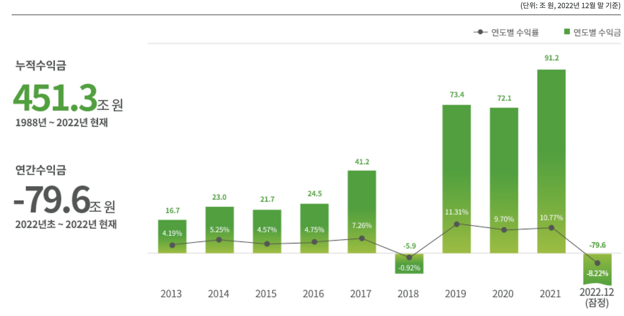 잘 모르겠네요… 국민연금은 지난해 기금 운용수익률이 -8.22%로 역대 최저를 기록했습니다. 이는 1988년 국민연금 제도가 도입된 이래 가장 낮은 수준입니다. 국민연금은 글로벌 금융위기가 닥친 2008년 -0.18%로 사상 첫 마이너스 수익률을 기록했고, 2018년 미·중 무역분쟁 등에 따른 글로벌 금융시장 약세 속에 수익률이 다시 -0.92%로 떨어진 바 있습니다.