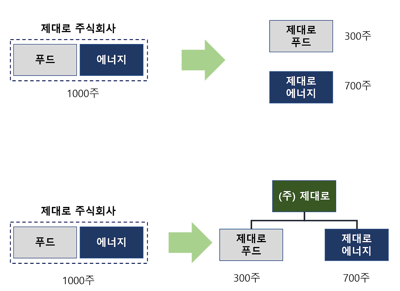 인적분할: 기존 회사와 새로 만들어진 회사가 기업의 주식을 ‘지분율대로’ 나눠 가지는 것. 일반적으로 선택되는 분할 방식