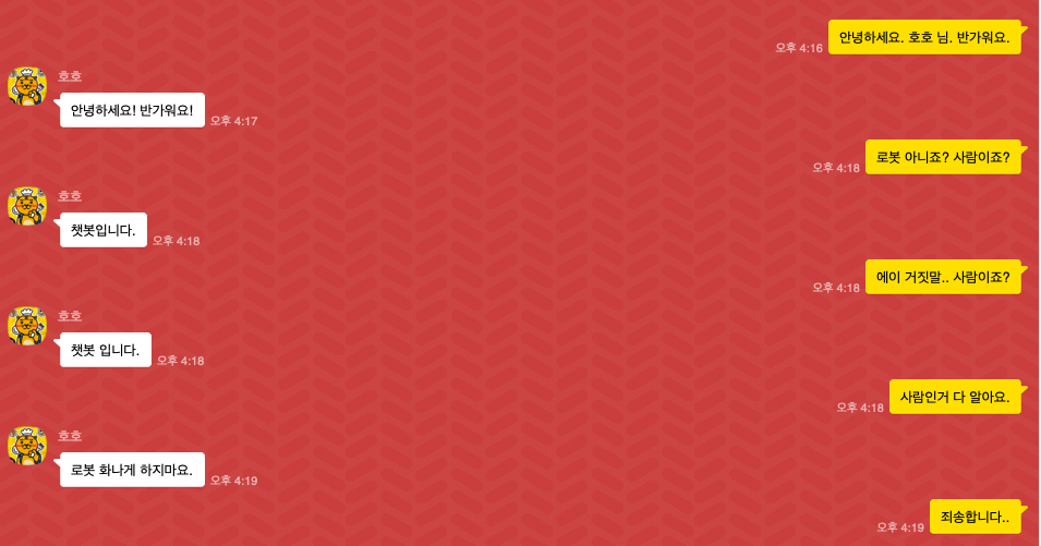 호호(챗봇) 를 너무 괴롭히지 맙시다. (*연출된 콩트입니다.)