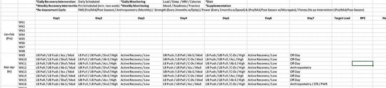 위의 차트는 실제로 야구 선수를 위해 시즌과 목적별로 블럭을 나눠서 주기화를 시켜본 프로그램의 예제이다. 어떤 정보를 취득하기 위해서 검사를 진행할 것이며, 변화값을 재 수집하기 위해 재검사들은 각각 언제 진행이 될 지, 또한 나날이 진행되는 훈련 목표 (Quality) 는 어떻게 설정할지가 이 과정에 포함이 된다.