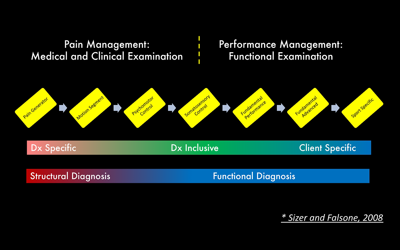 훈련의 최종목적지가 퍼포먼스에 있다면, 시작점은 바로 '안전' 이다. 선수들이 안전하고 건강하게 한 경기를 치르고, 한 시즌을 마무리하고, 또 다음 시즌에 대비하는 것이 바로 첫번째이다. 위 차트는 Texas Tech University 의 Phil Sizer 박사와 LA Dodgers 의 전 수석트레이너 Sue Falsone 에 의해서 2008년에 소개되었는데, 재활의 단계를 보면, 통증이 나타난 이후 나눠진 블럭의 가이드라인에 맞춰 선수들의 기능을 회복하고, 마지막에 스포츠에 특성화된 훈련을 진행하게 되는데 이 구조를 퍼포먼스 트레이닝의 연속체 (Performance Training Continuum) 라고 한다. Sizer & Falsone 는 세가지를 기준으로 프로그램을 진행 (Progression) 하였는데, 그 첫번째는 바로 '진단' 이다. 진단은 구조적 (의학적) 진단과 기능적 진단으로 나누어져 있는데, 구조적 진단은 대부분 병원에서 의사의 지휘하에 의학적 / 이학적 검사를 통해 진행되고, 기능의 진단은 경우에 따라 움직임, 체력/근력, 에너지 시스템, 준비도 등을 보게 되며, 트레이너들이 스포츠에 맞춰 특성화하여 진행하게 된다. 두번째는 구조적 진단을 통해 얻은 통증의 원인을 얼마만큼 중요하게 프로그래밍에 적용할 것인가 이다. 위 차트에서 볼수 있는 Dx 는 진단을 의미하는데, 빨간색일수록 중요도가 높고 발견된 통증의 원인을 해결하는데 집중을 하게 되고, 파란색으로 갈수록 통증의 원인 보다는 선수의 퍼포먼스에 더 집중 하게 됨을 의미한다. 쉽게 무릎 부상의 예를 들자면, 무릎에 있는 통증의 원인을 찾아 그 통증을 해결하는 치료와 재활을 하고 (Dx Specific), 통증이 관리되면서 무릎을 적극적으로 사용하는 복합적인 움직임을 점진적으로 만든 이후 (Dx Inclusive), 마지막으로 통증이 해결된 이후 필드로 복귀하여 시합과 훈련에 집중 (Client Specific) 하는 과정이다. 세번째는 치료나 운동을 선택하고 진행하는데 있어서의 기준을 설정 하는 것이다. 이 시스템의 설계는 팀이나 시설마다 여러가지로 달라질 수 있기 때문에, 한가지의 형태로 정의하는 것은 어렵다. 하지만, 모든 시스템은 통증이나 부족한점을 작은 단위 (Local) 에서 관리하고, 점진적으로 통합하여 큰 단위 (Global) 로 만들어 가는 과정을 포함 하고 있다.