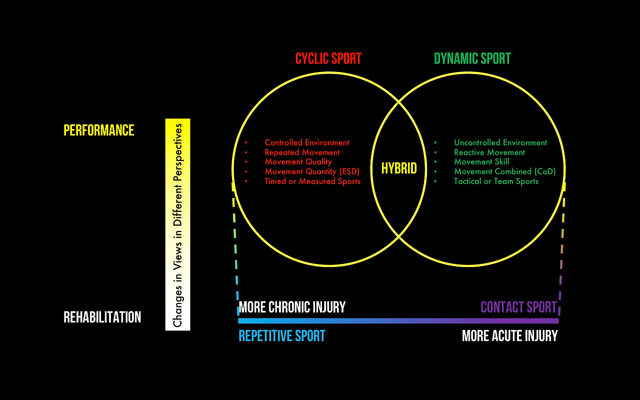 퍼포먼스의 관점에서는 움직임의 기술과 반복을 기준으로 스포츠의 분류를 나누게 되는데, 크게 두가지, 반복형 (Cyclic) 스포츠와 역동적 (Dynamic) 스포츠로 나눌 수있다. 반복형 스포츠란, 통제된 환경에서 같은 움직임을 반복하는 종목들로서 육상, 수영 등이 대표적인 예가 될 수 있다. 반복형 스포츠에서는 주변환경이 철저하게 통제 / 관리 되어있기 때문에 훈련 프로그래밍시에 가장 집중하는 부분은 반복의 가장 작은 단위가 되는 하나의 사이클 (Movement Cycle) 을 잘 완성시키는 것과, 어느정도의 빈도로 그 움직임을 반복할지에 대해 분석하여 에너지 시스템을 개발 (Energy System Development: ESD) 하는 것이다. 반대로, 역동적 스포츠의 특징은 반복형 스포츠에 비해 주변환경이 통제 되어있지 않고 변수가 많이 존재하기 때문에, 전략과 전술에 의해서 경기의 승패가 좌우 되는 경우가 많고, 신체적 / 정신적 준비도 (Preparedness) 와 여러가지 상황에 대한 대처능력 (Reactive Skill) 이 일차적으로 중요한 요소가 된다. 주로 농구나 축구 같은 팀 스포츠가 좋은 예가 될 수 있다. 스포츠의 역사에서 흥미로운 점은 역동적 스포츠는 인간이 자연이나 상대방을 이기고 정복하는 것처럼 외적인 (External) 배경이 많이 작용했던 대신, 반복형 스포츠는 스스로의 성장을 통해 자신의 한계와 겨루는 내적인 (Internal) 배경이 많았다는 점이다. 하여, 역동적 스포츠는 승리를 가져오기 위해 끈기, 투지, 전략 등이 가장 큰 요소로 작용했다면, 반복형 스포츠는 기록을 위한 힘, 파워, 유연성 등 체력적인 요소들이 1차적 필수 요소로 작용하였다. 이렇기 때문에, 트레이닝의 많은 이론들은 체력 (Fitness) 과 직접적으로 연관성이 더 높은 반복형 스포츠에서 탄생한 경우들이 많이 있었고, 이를 역동적 스포츠에 적용하는 사례들이 많이 있다. 예를들면, 축구에서 공격과 수비를 잘하는 것 만큼, 그를 위해서 잘 뛰고 오래 뛸 수 있는 것도한 중요하기 때문에, 잘 달리는 훈련을 하는 것처럼 말이다.