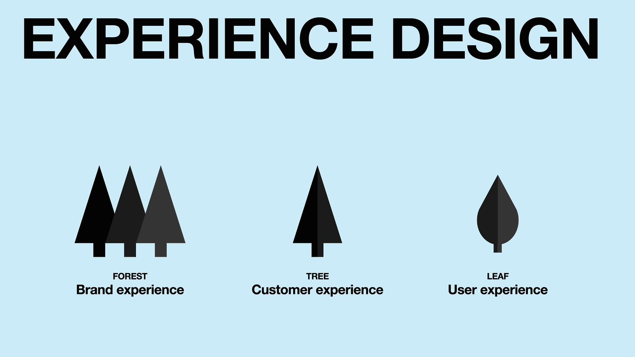 단순하게 크기로만 보면 브랜드 경험을 설계하는 것이 숲의 설계, 고객 경험은 나무, 사용자 경험은 잎의 설계라고 볼 수 있습니다. 끝으로 서비스 디자인은 이 모든 층위의 경험 설계를 하는 과정에 필요한 도구와 방법을 제안하고 적용하는 디자인이라고 보시면 되겠습니다.