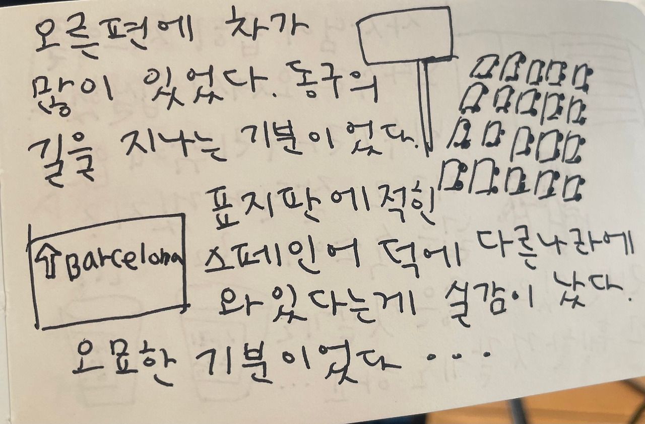 라디오를 통해 아주 빠른 템포로 흘러나오는 말. 그리고 밤의 어둠 사이 큰 간판과 거리를 훑으며 숙소로 가는 길. 놀라움에 젖어 있다가 번뜩 다시 걱정이 된다. 기사님 머리 위에 전자로 된 숫자가 계속 올라가고 있었다. 계기판일까. 카드 안되면 어떡하지, 바가지 씌우는 거 아냐? 이런저런 걱정과 기대가 뒤섞였다. 숫자가 올라갈 때마다 조금씩 조급해진다. 괜찮아, 카드 있으니까. 가로등 불빛을 조명 삼아 회화책을 뒤적거렸다. 와중에 스페인어로 묻고 싶었다. 잠깐 정차했을 때 물었다.