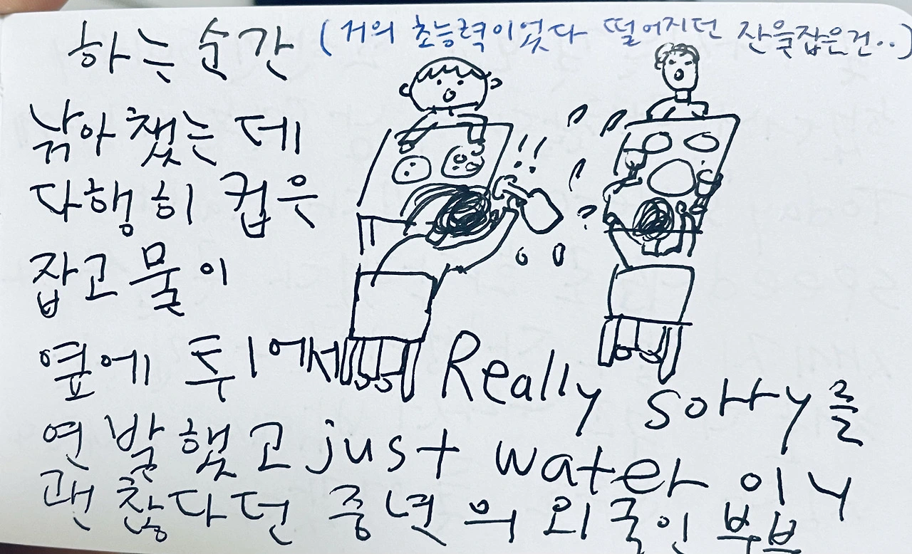 불안한 예감은 때때로 틀리지 않아서 더 무섭다. 한창 맛있게 먹던 그때 그의 손이 툭 - 잔을 스쳤다. 물이 쏟아져 옆의 부인에게 튀는 동시에 아래 바닥으로 떨어져 깨지려던 그때 반사적으로 나간 오른손으로 잔을 잡았다. 휴. 우선 물을 닦는 그녀에게 "Really sorry.." 를 연발했다. 그들은 괜찮다고 하고 식사를 이어가고, 아들에게 눈빛을 찌릿 한번 보낸 뒤 잔을 둘 다 내 앞에 두었다. 어느정도 다 먹었을 때 쯤 오른쪽 테이블은 일어나기 직전이었다. 다시한번 미안하다고 말했다. 한국에서나 타국에서나 행여 내 아이가 밉보일까, 아이를 챙기지 않는 무개념 엄마로 보일까봐. 한국 대표로 온 것도 아닌데 한국인에 대한 안좋은 인식을 남길까 별의 별 걱정을 다 하며 사과의 사과를 덧붙이는 내게 말했다.