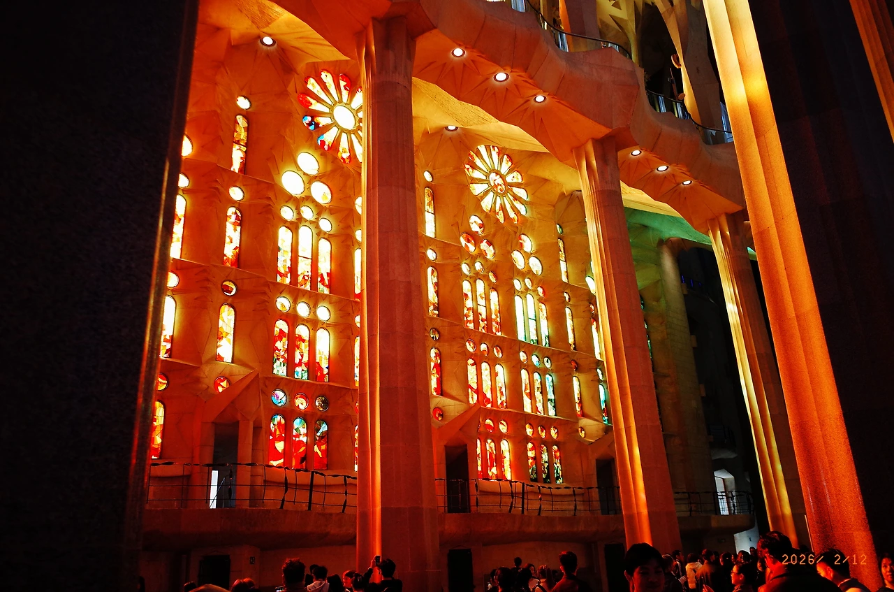 S의 말을 떠올리며 들어선 성당 안. 앞서 오디오 가이드에서 들은 것 처럼 나무를 닮은 거대한 기둥이 서있었다. 그리고 안으로 들어서자 오후의 빛이 쏟아져 들어오고 있었다. 색색의 빛. 각각 다른 색이지만 부드럽고 벅차게 들어오는 빛. 만약 세상이 처음 시작될 때 빛이 쏟아졌다면, 세상을 구원할, 혹은 최초의 생명체가 등장할 때 빛이 나왔다면 이런 모습이었을까. 둘이서 한참 빛을 바라보았다. 사진과 영상으로 모두 담아갈 수 없어 오래도록 눈에 담았다.