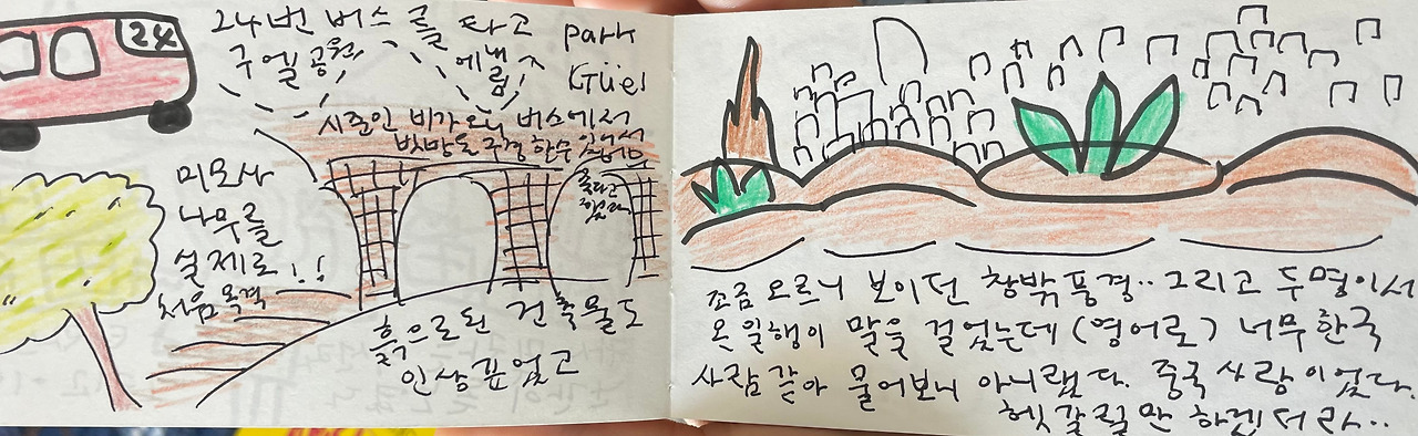공용 거실에는 최대한 있지 않을 생각이었다. 방에도 간이 탁자와 의자가 있어 저녁거리를 들고 방으로 들어왔다. 옆 방 청년들은 아직 복귀 전인 것 같았지만, 다시 불편할 수 있는 여지를 만들고 싶지 않았다. 그들은 바르셀로나의 저녁을 더 즐기다 오려는지 소식이 없었고 우린 저녁을 다 먹고 씻은 후 각자의 침대에 올랐다. 무거워진 눈을 들고 수첩을 열어 오늘 있었던 일을 그리고 쓰던 중이었다. 그때,