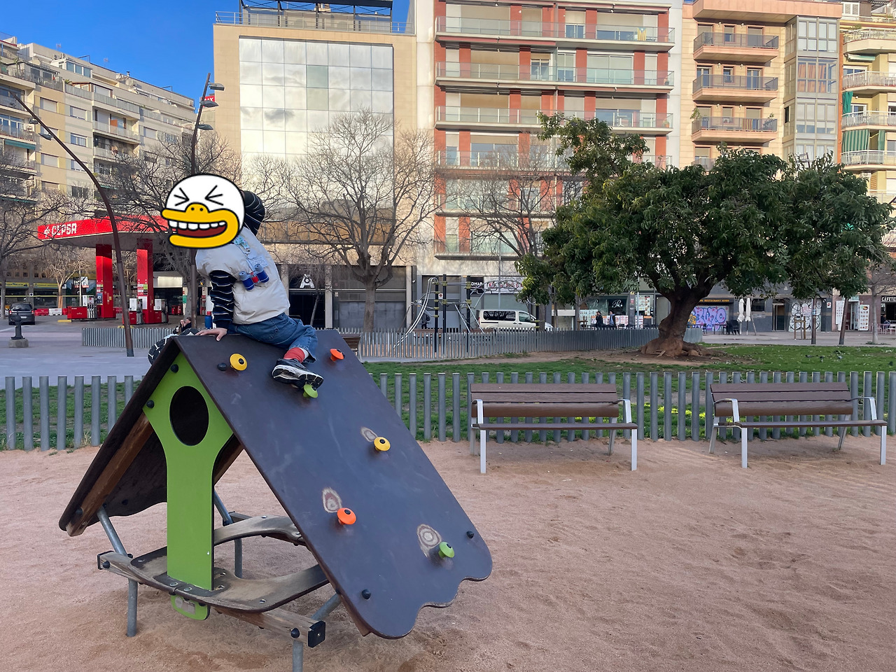 크고 무성한 나무 아래 앵무새처럼 보이는 새들이 여기저기 흩어져 함께 도보를 걷고 있었다. 나뭇잎 사이로 쏟아지는 빛, 이국적인 나무와 새. 영화의 한 장면 속에 있는 기분이었다. 길을 따라 쭉 가다 보니 점점 큰 건물들이 나오고 놀이터가 또 하나 등장했다. 녀석이 놓칠 리 없었다. 운동기구가 있는 곳에서 잠시 멈춰 운동(비슷한 것)을 하고 놀이터가 나오자 한번 더 멈췄다. 우리 여행의 테마 중 하나는 놀이터가 아닐까. 아이와 함께 하지 않았다면 보지 못했을 것이 하나 더 늘었다.