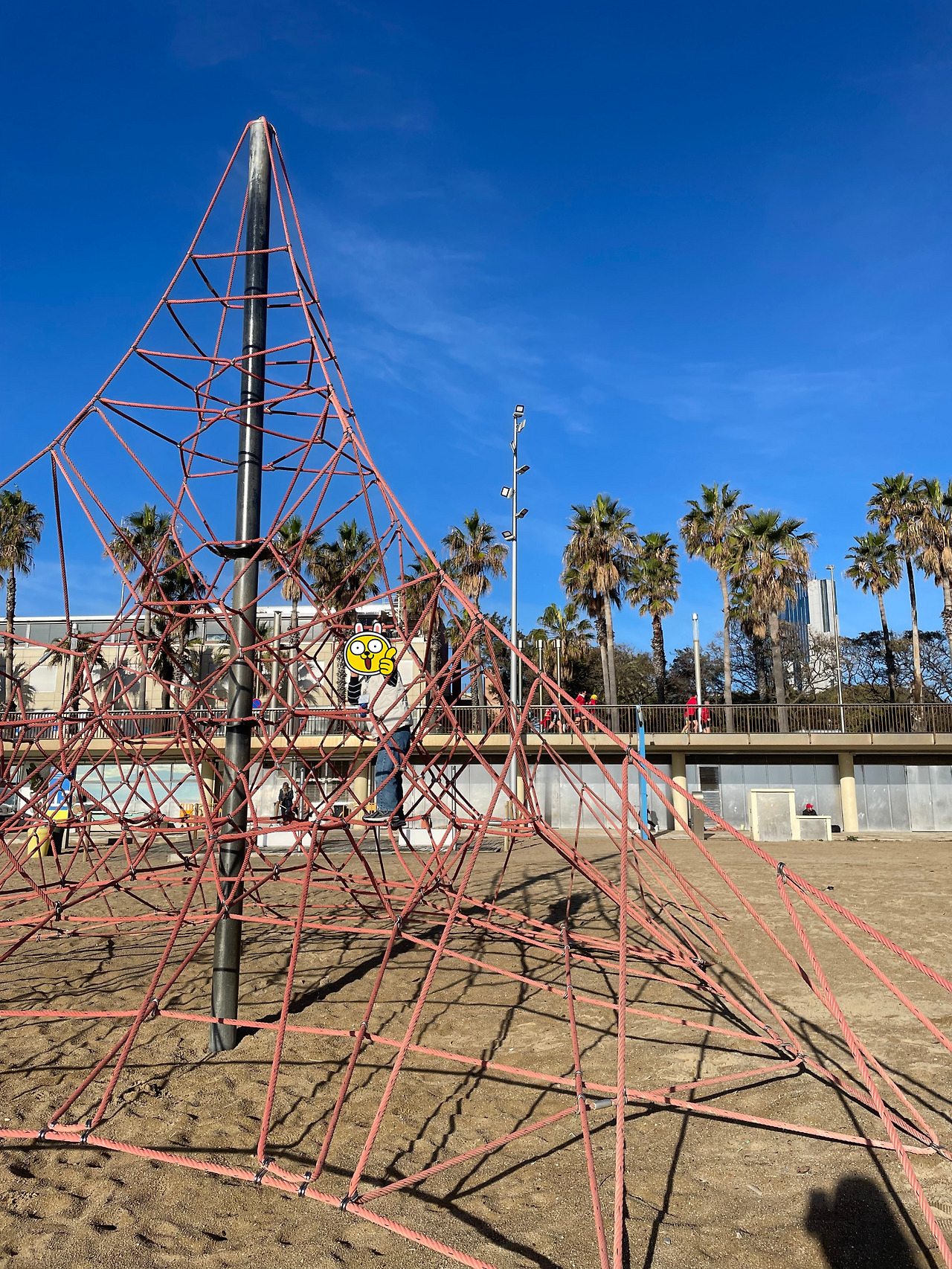 멀리서 보았던 반달 모양의 건물이 더욱 가까워졌고, 놀이터는 커다란 그물 하나가 다였지만 그것만으로 충분했다. 모래사장 옆 운동기구존에서는 각국의 헬스 마니아들이 운동을 즐기고 있었다. 동양의 꼬마는 거침없이 그들 곁으로 가서 해볼 만한 운동기구를 이것저것 즐겼다. 큰 어른 중 몇몇이 미소를 보낸다.