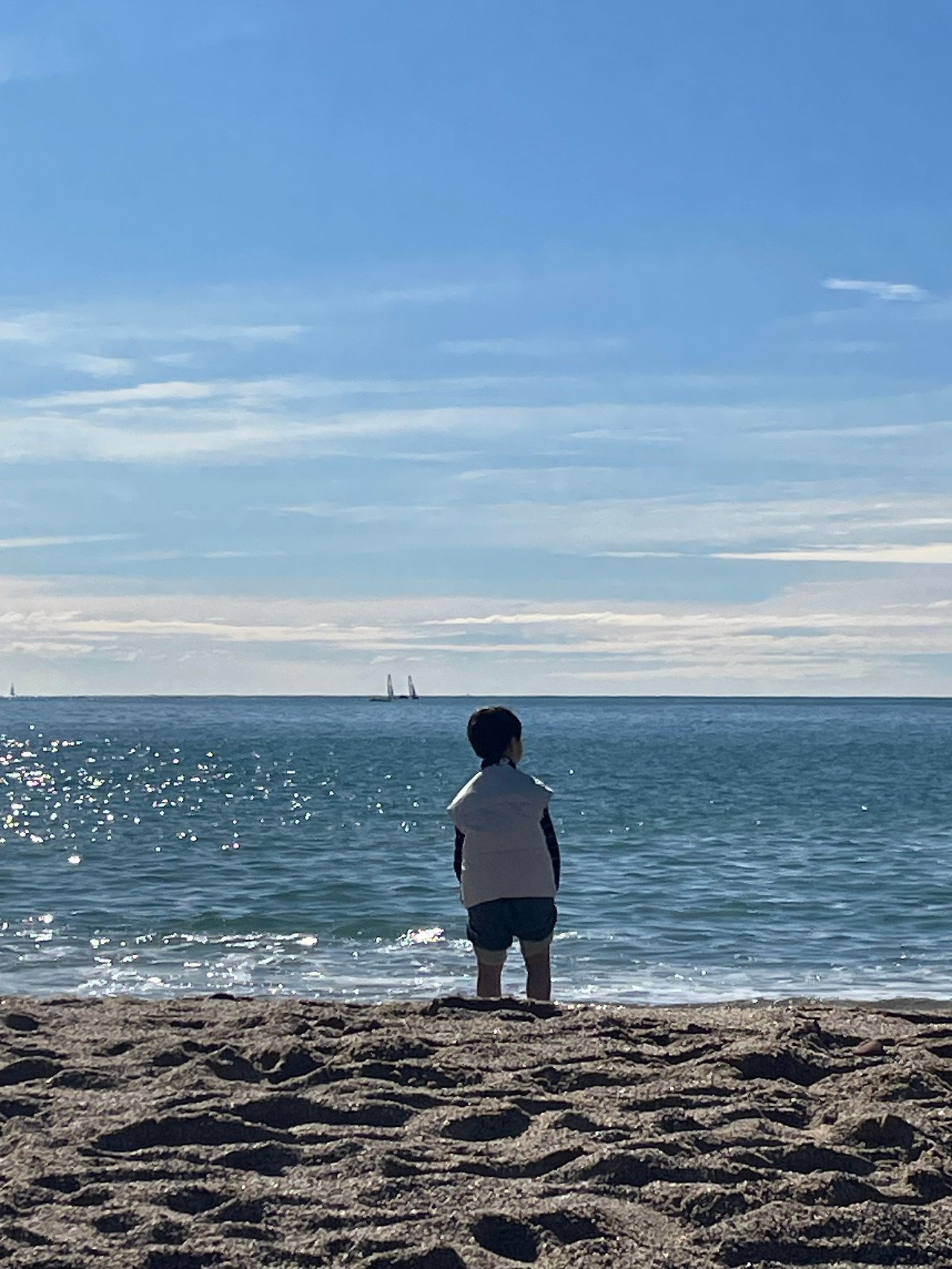 파도 가까이 들어갔다가, 물이 닿을라 와다다 도망가는 녀석을 보고 있던 게 나뿐만이 아니었나 보다. 흐뭇하게 지켜보던 서양인 아저씨가 옷을 훌러덩 벗으시더니 아이에게 가서 손을 내밀었다. 아들은 파도에게서 도망가던 그 스피드로 다시 도망갔다. 그렇다면 어쩔 수 없지, 하는 모양새로 아저씨는 성큼성큼 바다로 들어갔다. 보고 있자니 지금이 어느 계절인지 분간이 가지 않는다.