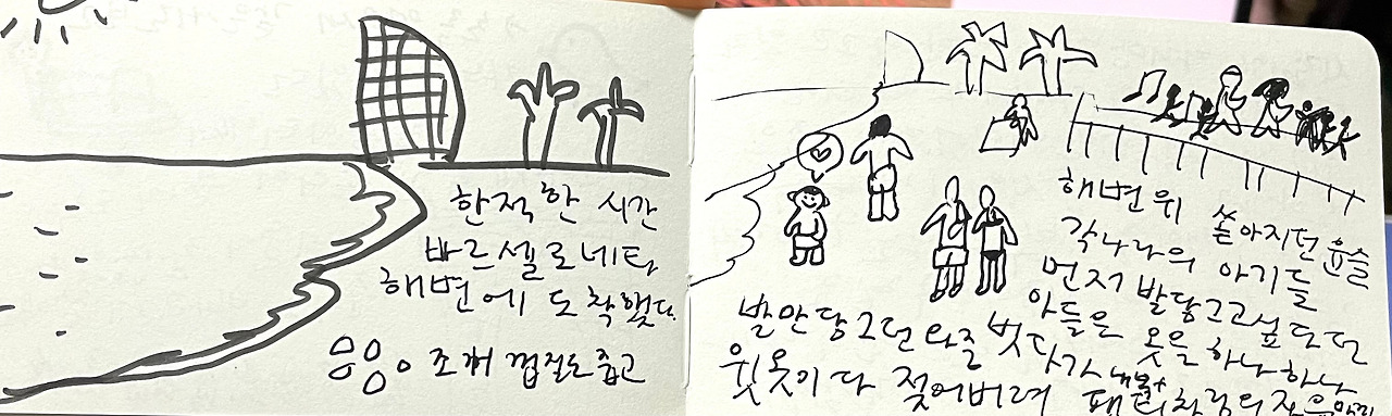 모래사장은 언제나 커다란 품이다. 모래를 헤집다가 어느덧 성을 만드는 녀석을 뒤로하고 눈에 보이는 작은 조개껍데기를 주웠다. 각 나라 해변마다 각기 다른 조개껍데기가 있다고 들었던 게 떠올라서. 보석을 찾듯 하나씩 주워 손에 담는다. 손바닥 위에 조개껍데기와 햇빛이 다각다각 내려앉았다.