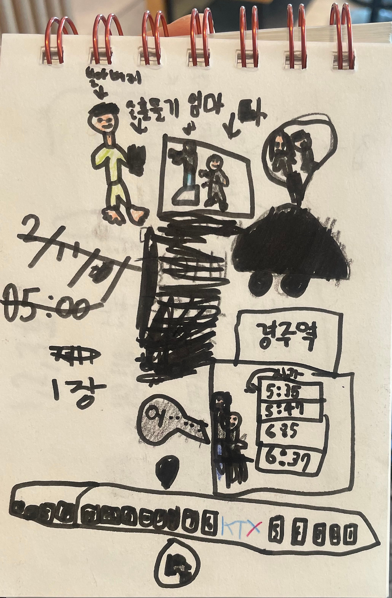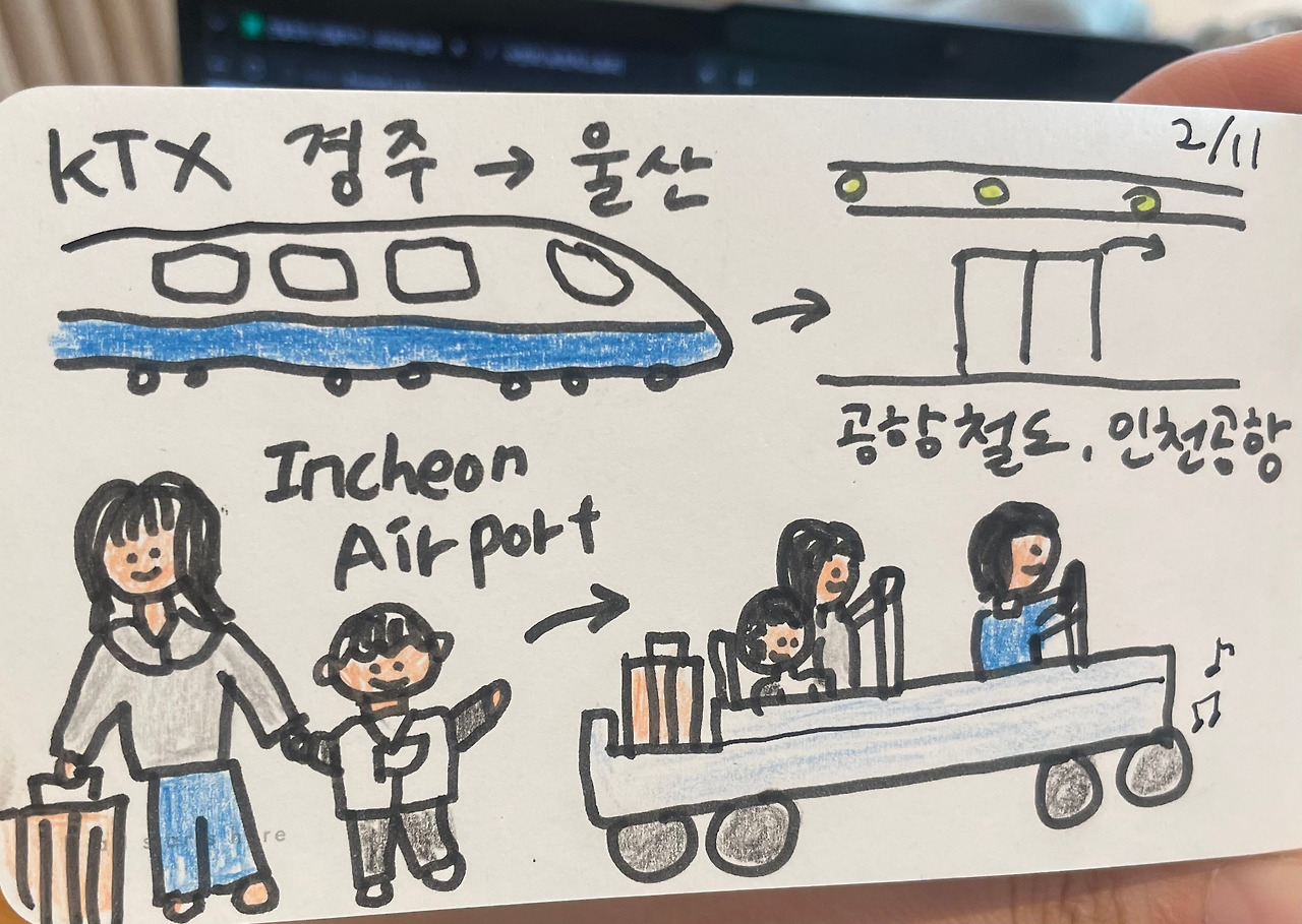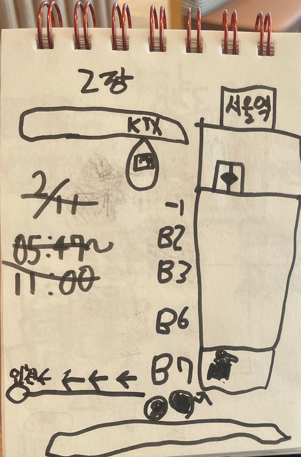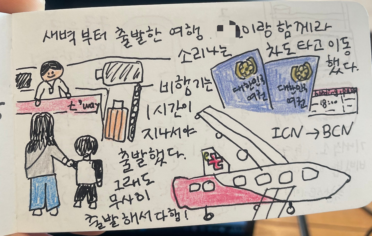 우리 처음으로 해외여행 가요! 라고 말하듯 이동하는 내내 전동차에선 후진할 때 나올 법한 노래가 흘러나왔다. 금세 엘리베이터 앞이다. 감사와 감상에 젖어 차에서 내리고 보니 아들은 가방을 앞으로 꼬옥 안고 있었다. 설마하고 물어보니 소매치기가 올까봐 그렇단다. 아들아, 우리 아직 한국이야. 언제나 나보다도 조심성이 투철하달까. 망원경과 노트, 색연필이 든 가방을 행여 누가 훔쳐갈까 걱정하는 널 보며 소중한 것과 탐낼만 한 것의 차이를 생각했다.