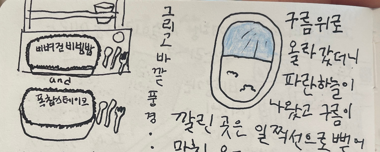 다만 창밖 풍경을 오로지 누릴 수 있다는 건 큰 장점이다. 어느덧 끝없이 펼쳐진 구름. 지평선과 수평선이 있다면 이건 운평선이라 불러야 할까. 드래곤볼의 근두운에 관해 아들과 이야기할 때쯤 첫 번째 기내식이 나왔다. 같이 와서 좋은 점 또 하나. 둘 다 시켜서 나눠먹을 수 있다는 것. 비벼진 비빔밥이 생각보다 매콤해서 결국 대부분은 내 몫이었다만.
