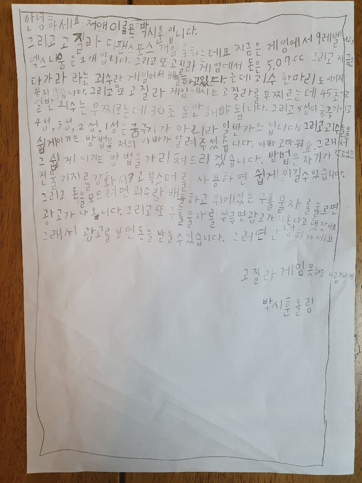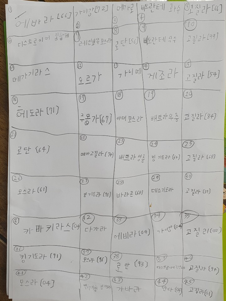 옆에 앉아서 한참을 쓰더니 내게 가지고 왔는데 제목은 "고질라 게임을 못하는 사람들에게 "였다. ㅎㅎ 보통 남자아이들은 글 쓰는 걸 정말 싫어하는데 자기가 잘 알고 좋아하는것이다 보니 A4용지의 반을 꽉꽉 채워 썼다. 또한, 어릴 때부터 언제나 이런 식으로 자신이 좋아하는 관심분야에 캐릭터들이 있으면 전부 스스로 적으면서 외우고 놀았다. 난 이렇게 노는 아이가 좋다.^^