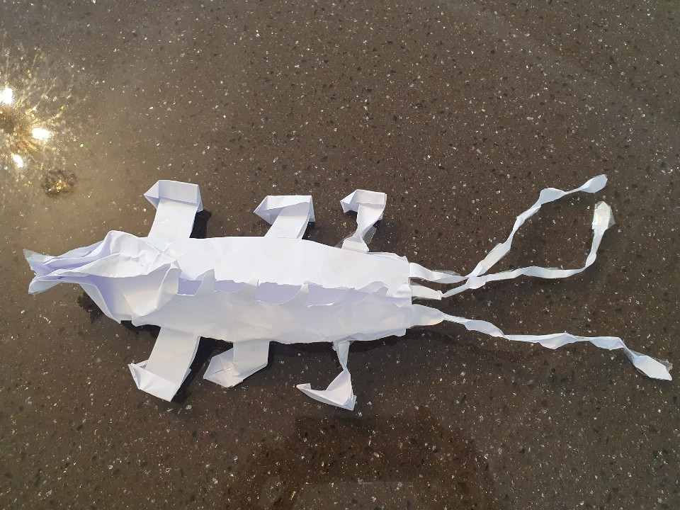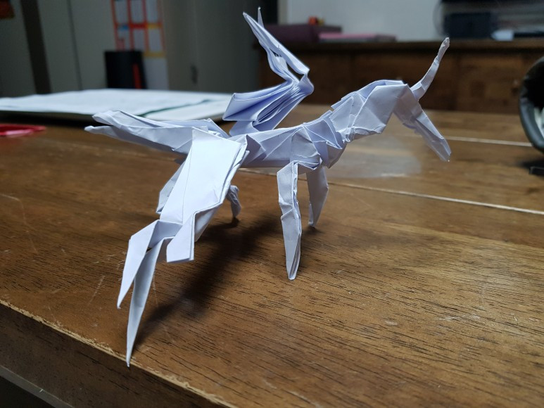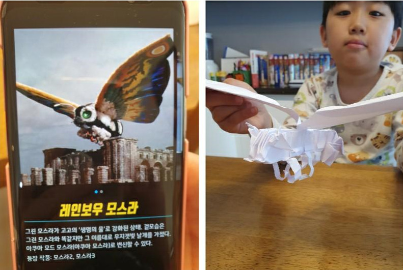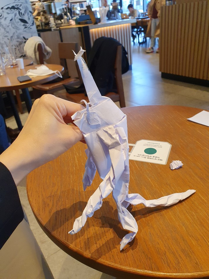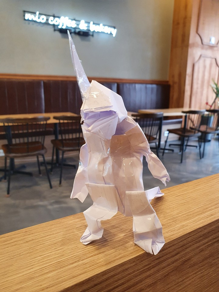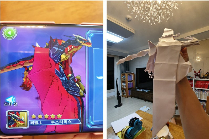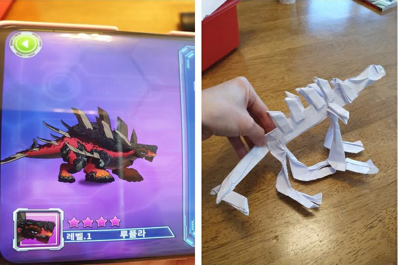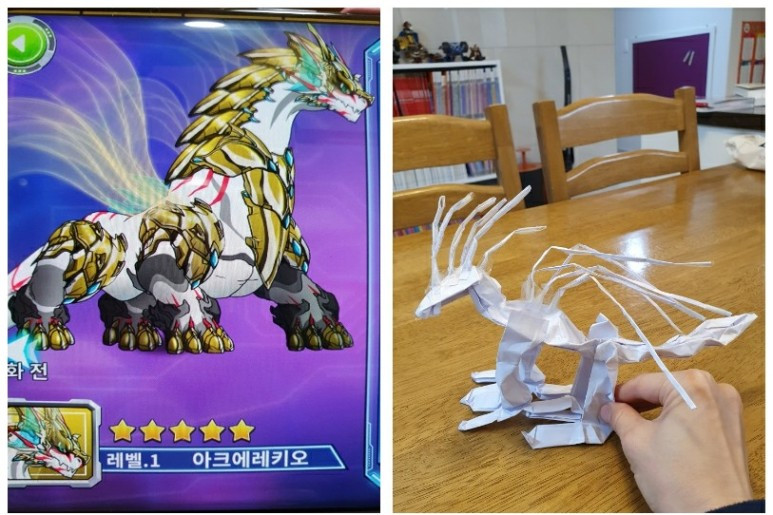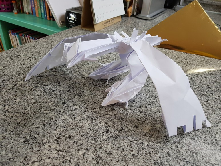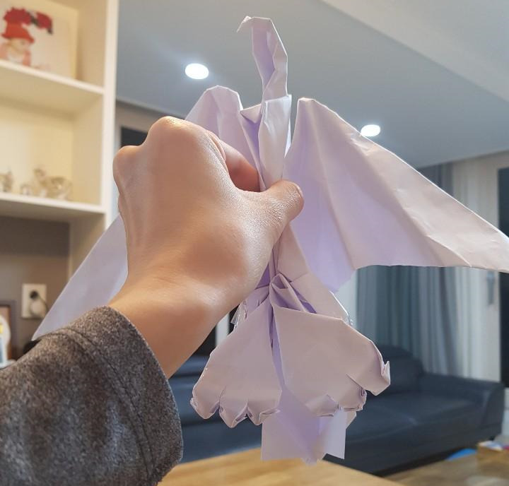 둘째가 1학년 때 접은 포켓몬스터에 나오는 루기아. 엄청나게 칭찬을 해주니 이게 바로 시작이었어요. 그런데 큰애가 이 날 울었어요ㅜㅜ 자기는 다른 캐릭터를 보고 접었는데, 동생 거랑 너무 비교될 만큼 자기가 만든거는 모양이 잘 안 나왔는데도 엄마가 괜찮다 해주니 그것도 자존심이 상했던 거죠. 둘째는 이제 색종이는 필요 없고 늘 A4 종이로 만 접어요.