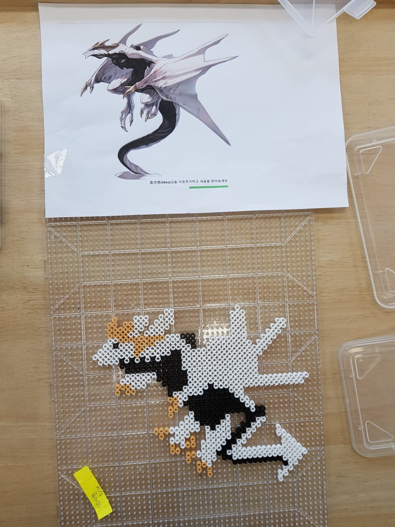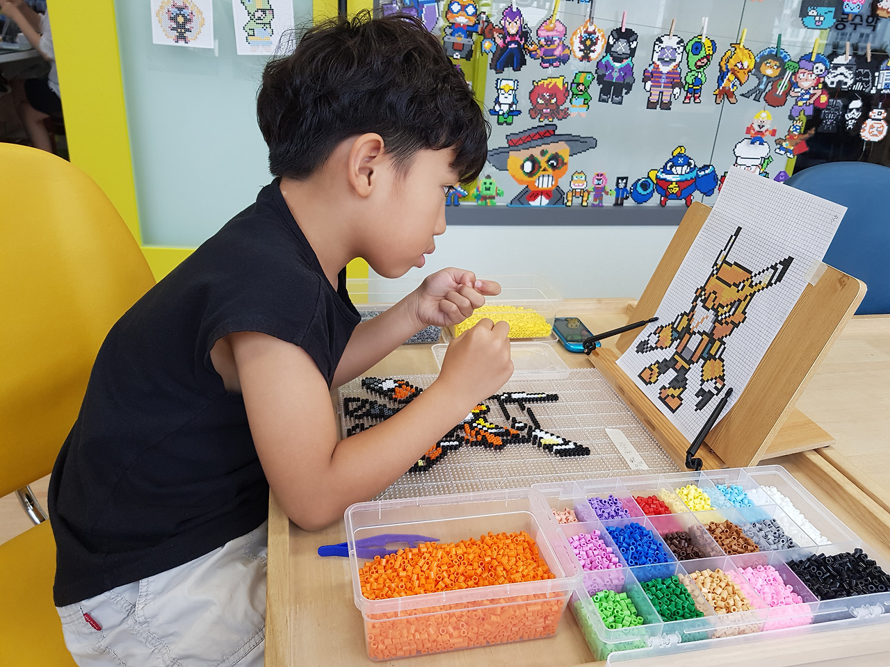 그러고 나서 1학년이었던 둘째가 레고에서 그다음으로 빠진 건 비즈였는데요. 이것도 처음엔 도안을 보고 하다가 나중엔 도안에서 하고 싶은 게 없다고 레고방 선생님께 사진을 프린터 해달라고 했어요. 프린터 해달라는 아이는 처음이라고 당황하시기도 했습니다. ㅋㅋ