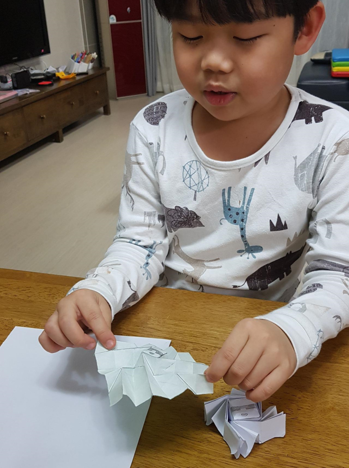 저는 둘째의 자존심을 건드리고 싶지 않아서 이렇게 어려운 걸 형보다 2살이나 어린데 이만큼 접은 것도 대단하다. 하지만 꼭 이걸 다 따라접어야 할 필요는 없다. 지금부터는 이미 어느 정도 형태는 나왔으니 네가 만들고 싶은 모습을 상상하며 접으라고 했죠. 새롭게 만드는 게 더 대단한 거라고. ㅋㅋ