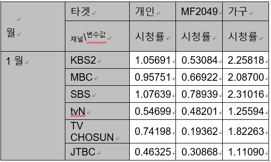 예를 들어 1월 한달 주요 6개 방송사의 평균 시청률로 설명해보겠습니다.
