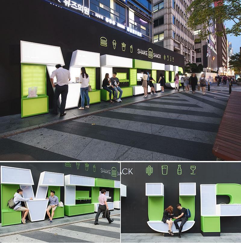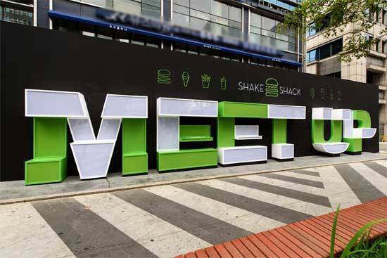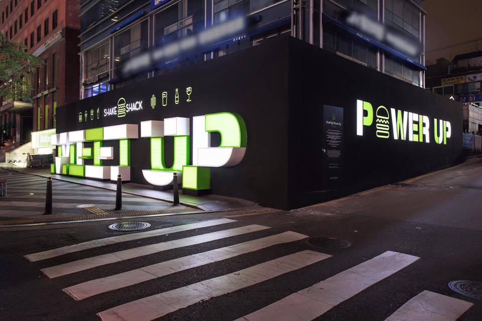 “우리 만나자, 우리 힘내 자.”대형 목공 공사를 통해 ‘MEET UP, POWER UP’ 글자를 입체적으로 제작해 도심 속 큰 벤치이자 그늘막이 될 수 있게 했다. 또 ‘파워업’은 핸드폰을 충전하라는 의미도 있었다. 그래서 핸드폰 기종별 충전기를 20개가량 설치하여 ‘MEET UP, POWER UP’ 글자에 앉아 충전하면서 친구를 기다리거나 쉴 수 있도록 기획했다. 저녁에는 대형 아크릴판 뒤로 글자 전체에 조명을 넣어 쉐이크쉑을 연상하는 따뜻한 톤의 연두색 조명을 켜기로 했다.