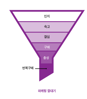 마케팅 깔때기는 브랜드를 인지하는 단계, 구매를 고려하는 단계, 구매 결정을 내리고 구매를 실행하는 단계, 반복 구매하는 단계 이렇게 5~6단계로 구분한다. 하여 초반에는 브랜드 인지도를 높이기 위한 홍보 및 마케팅 활동을 펼치고 구매로 이어질 수 있는 제품 사용 후기, 리뷰 및 각종 설득력 있는 영상 자료 등으로 바이럴을 일으키는 것이다.