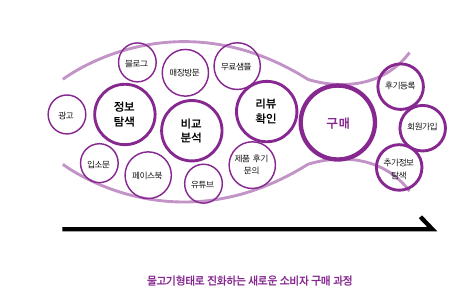 과거 비교적 단순하고 브랜드에서 고객으로 흐르는 수직적인 구매 여정의 이론이 진화해 최근에는 새로운 형태로 소비자 구매 과정을 설명한다. 켈리 문니의 책 《오픈 브랜드 (Open Brand) 》에서 밝힌 고객 구매 고객 여정은 위의 그림과 같이 물고기 형태로 변화했다고 한다.