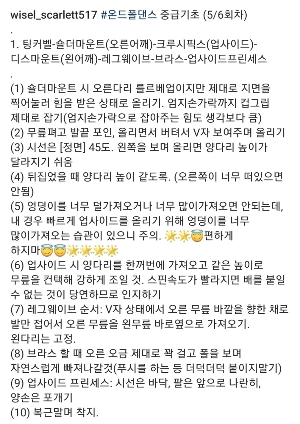 그런데 이 때 마침 성은원장님께서 저에게 중급기초반을 권유하셨습니다. (놀라운 건, 전 이런 생각을 성은쌤에게 한마디도 한 적이 없다는 것입니다.. 제가 스피닝폴을 또 다시 접으려던 건 모르셨죠 쌤,,) 수업을 들으면서 왜 성은원장님이 제게 이 수업을 권했는지 알게 됐어요. 온드폴댄스에서 중급기초반을 개설하며 가장 염두에 두었던 대상은 폴을 오래 했대도 중요한 포인트와 기초를 놓치는 폴러였다고 합니다. 저는 그 목표에 정확히 부합하는 대상이었습니다. 이외에도 막 중급으로 넘어가는 길목의 폴러들이 처음부터 올바른 기초를 따라갈 수 있도록 커리큘럼이 짜여져 있습니다. 그래서 저 또한 새싹폴러분들과도 함께 기초수업을 들을 수 있었어요.