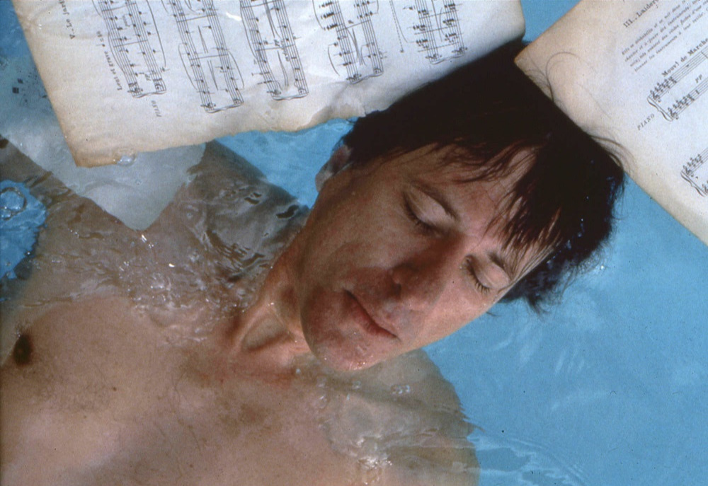 악보가 둥둥 떠 있는 수영장에서 물 위로 얼굴을 내밀고 누운 데이비드. 영화 <샤인> 스틸컷