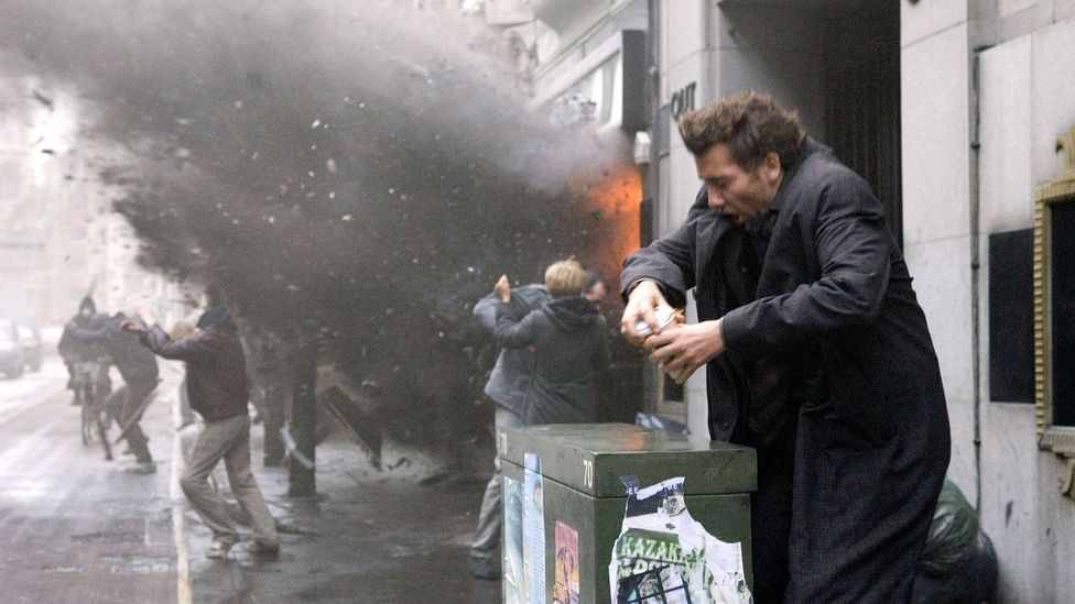 아침 출근길 테오(오른쪽)가 지나온 상점에서 갑자기 폭발이 일어나는 장면. 영화 <칠드런 오브 맨> 스틸컷