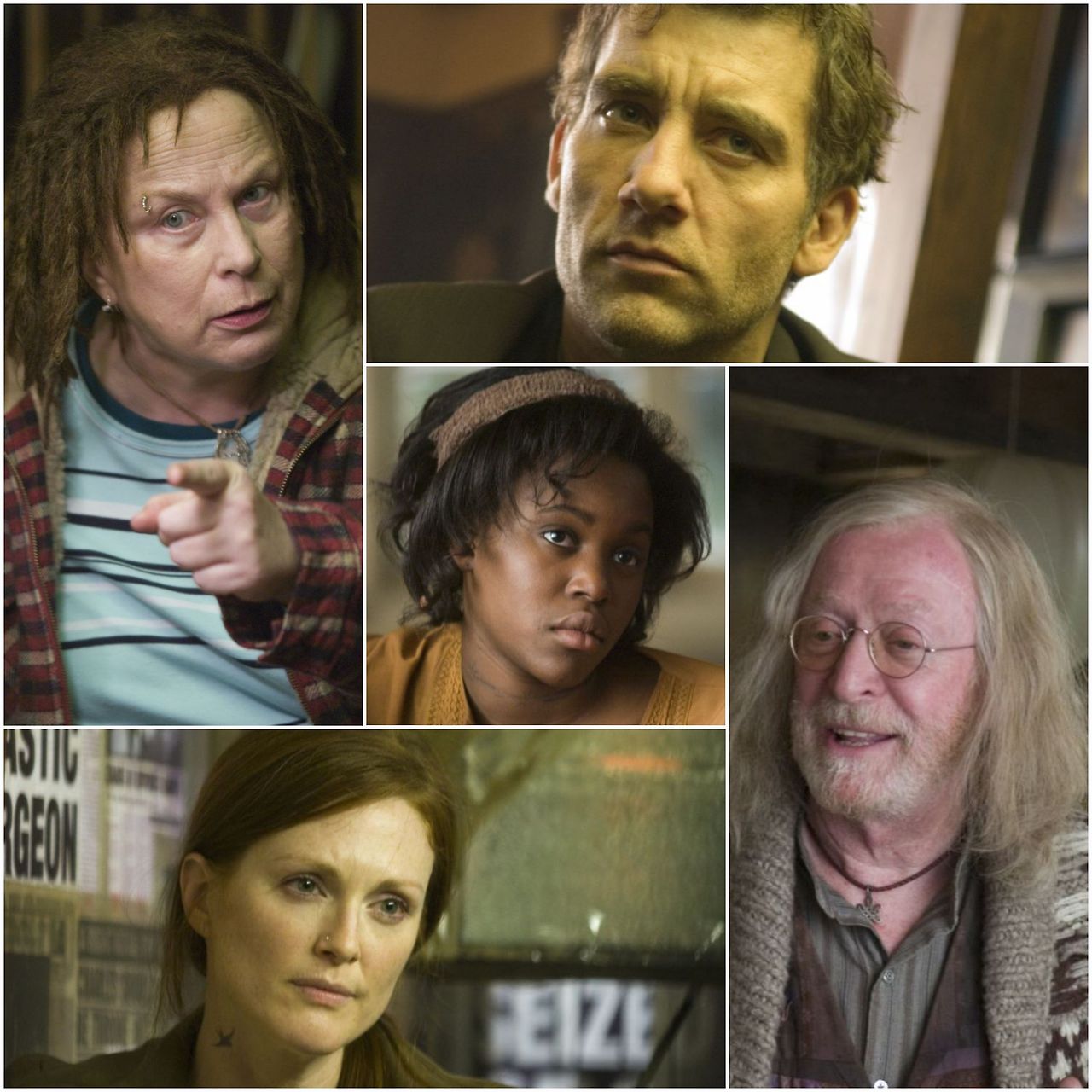 왼쪽 위부터 시계 방향으로 키(가운데)의 곁을 지키는 미리암, 이들의 여정을 책임지게 된 테오, 테오의 오랜 친구 재스퍼, 테오의 전 아내 줄리안. 영화 <칠드런 오브 맨> 스틸컷