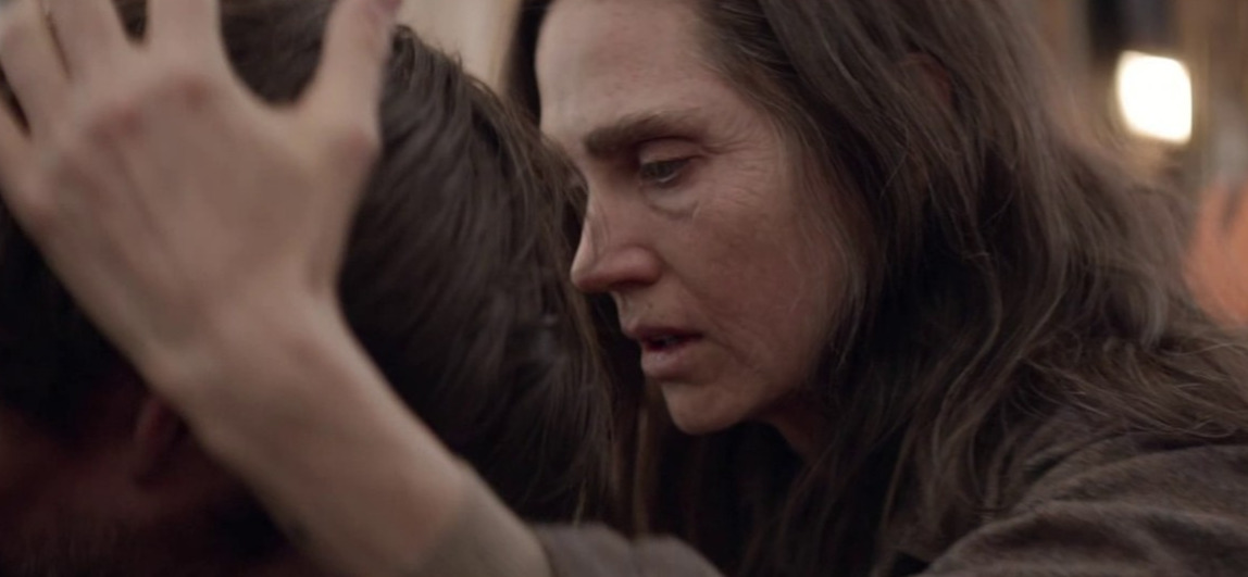나나(오른쪽)가 자신을 찾아온 아들 아이반의 머리를 감싸안는 모습. 영화 <하늘 높이> 스틸컷