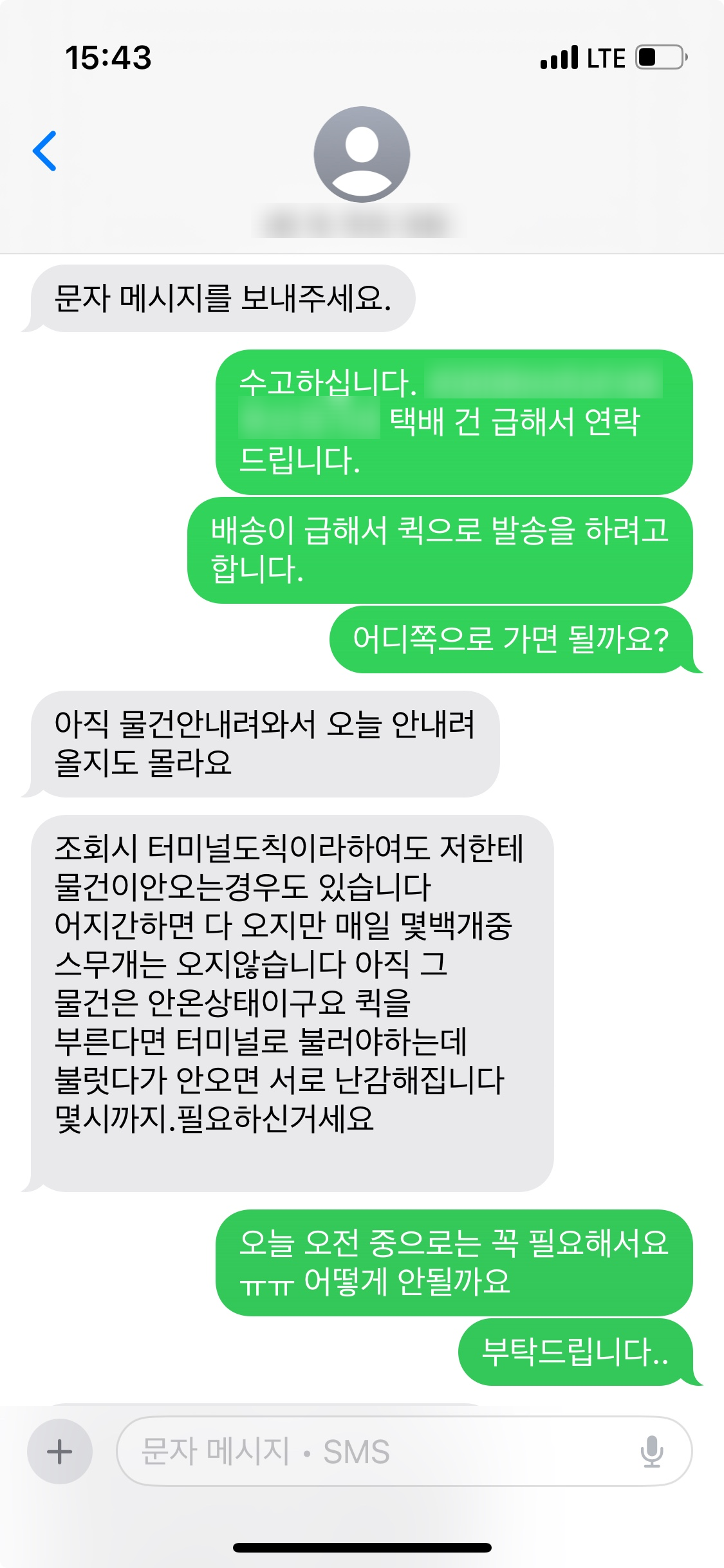 그리곤 전화를 끊자마자 바로 현지 퀵 업체를 찾아서 택배 터미널부터 도착지까지 견적을 받고, 택배가 오늘 안나올 수도 있는 상황에서 퀵 기사님에게 물건 픽업을 해와달라는 무리수를 던졌다. 요금이 얼마가 나오든 사비를 써서라도 지불할 생각이었다. 퀵 기사님은 물건이 없는데 어떻게 가냐고 반문했지만, 사정사정해서 요청을 드렸다.