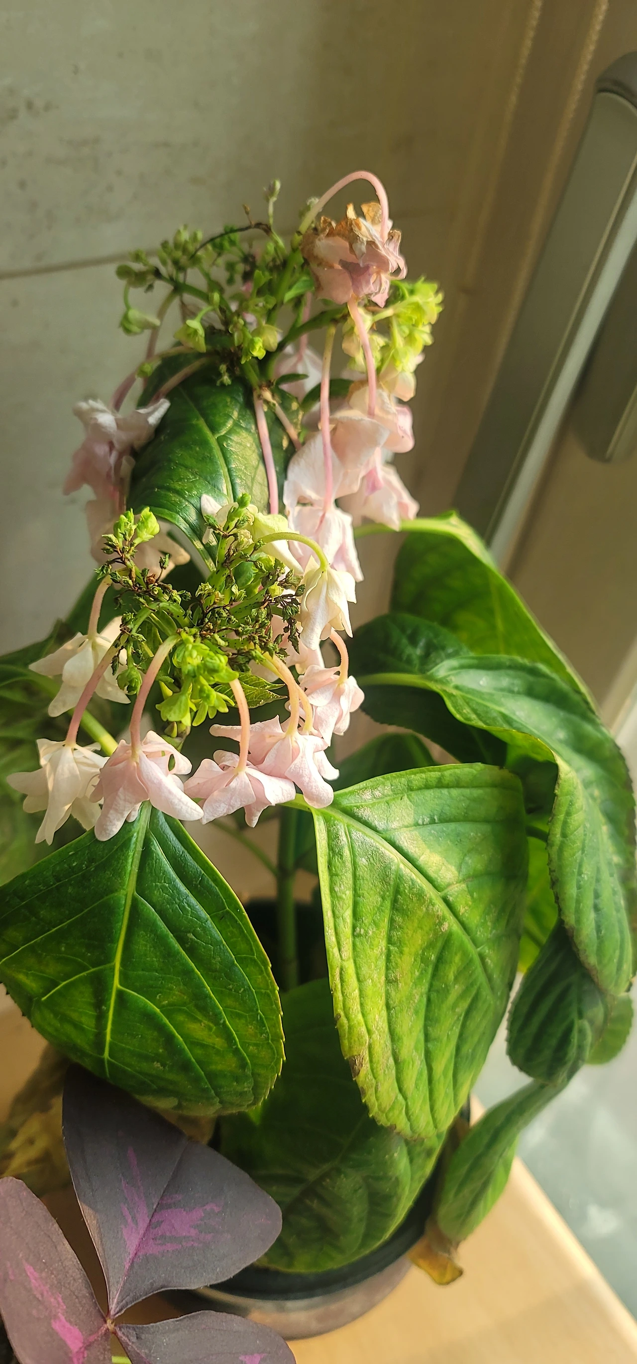 그나마 오전에 비치는 해 덕분에 햇빛은 큰 문제가 없으나 통풍이 문제다. 환기가 쉽지 않으니 우리 집에 와서 짧게 수명을 다하고 떠나는 식물들이 있다. 허브종류와 수국등이다. 허브는 성공해 본 적이 없고, 수국은 아예 들일 생각을 하지 않는다. 그런데 2주 전 친한 언니가 수국 화분을 선물했다.
