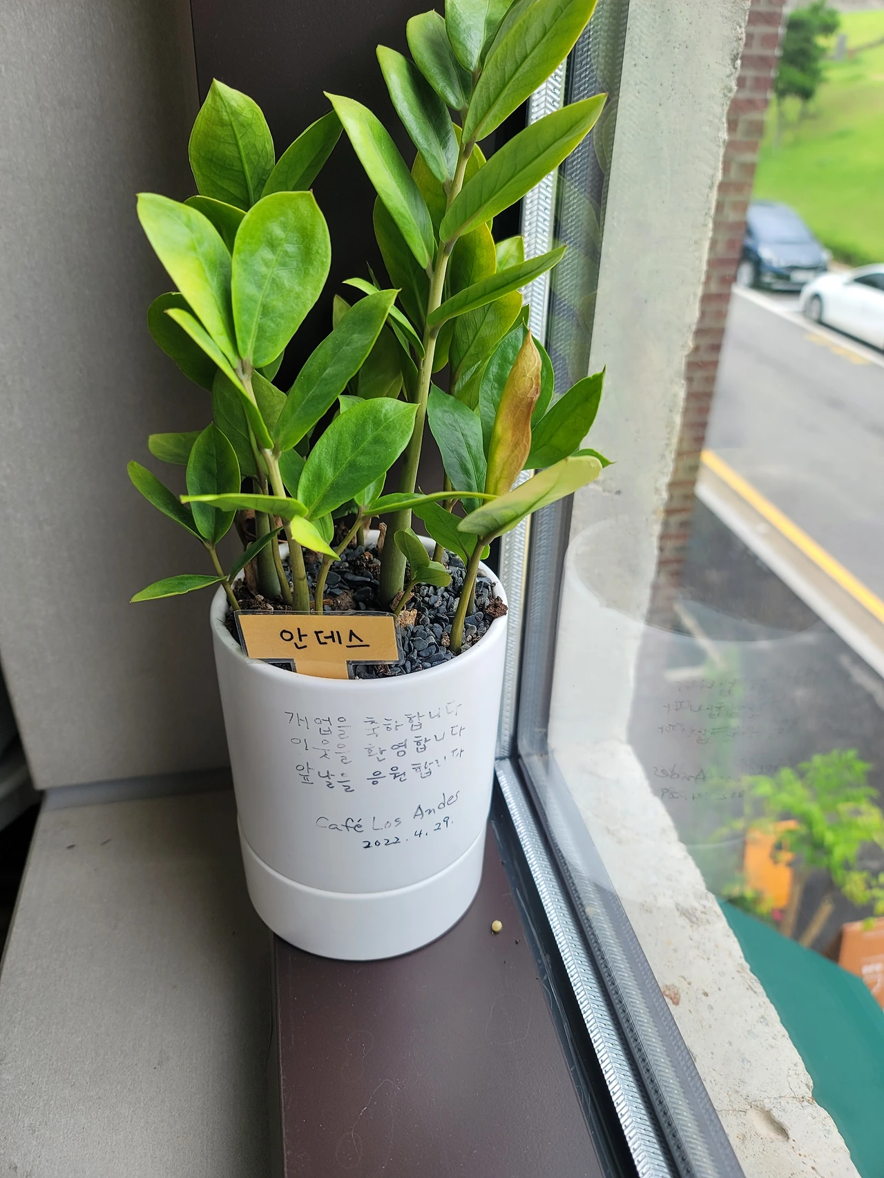 약속시간이 남아서 커피 한 잔을 하며 책을 읽으려고 창룡문 근처 카페에 왔습니다. 안데스 음악이 흐르는 안데스문화원카페에 가려다 오늘은 그 옆 카페에 자리를 잡았습니다. 커피를 들고 2층 창가에 앉았는데 화분들이 보입니다. 3층으로 올라가는 계단 창가에 있는 금전수 화분에는 특이하게 글씨가 쓰여 있어서 자세히 들여다봅니다. '카페 안데스?'